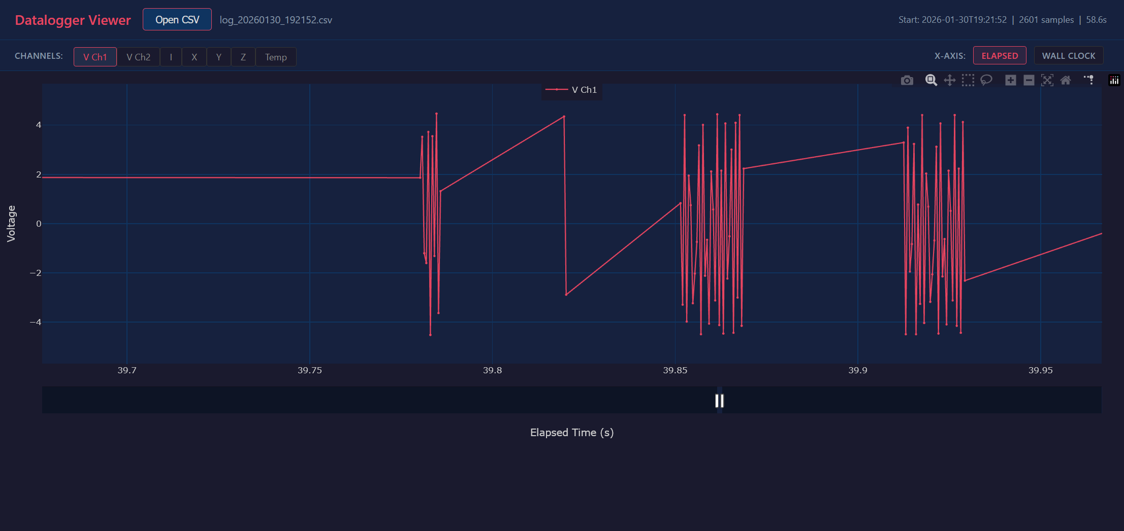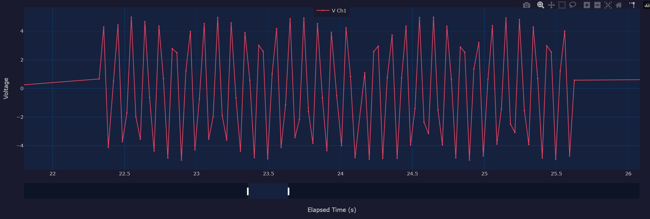 This is with only the voltage turned on, so it’s logging at a max interval of 2kHz. When you look at the data you see many bursts at that rate, until it happens to catch 2 points fairly close to each other, and then there is a ~40mS pause while it writes the data.